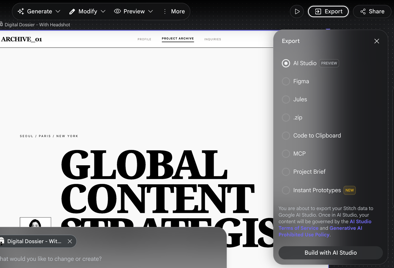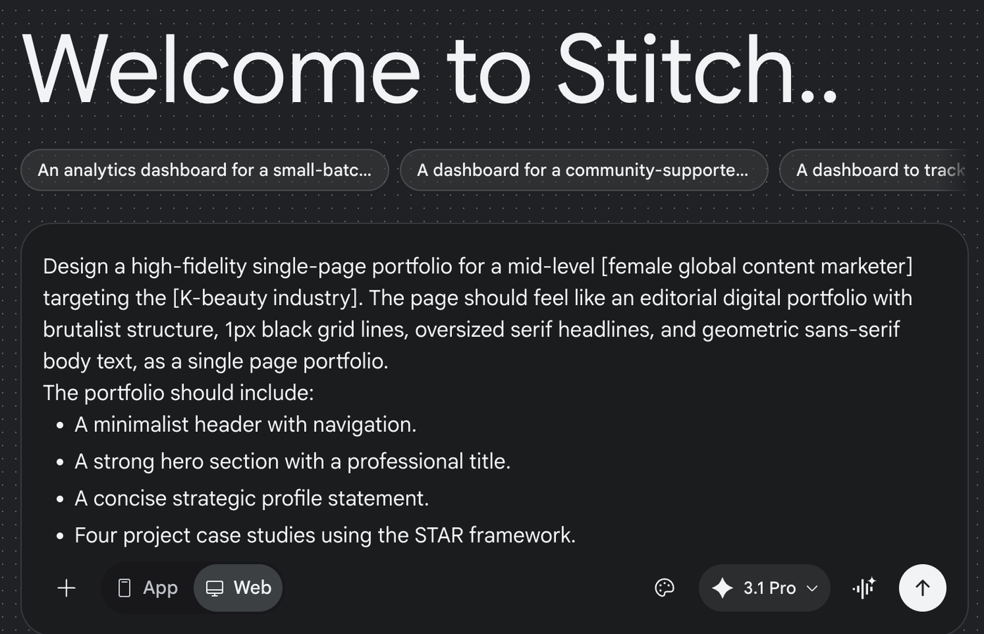 In 2026, one of the simplest ways to start is using Google Stitch, which Google describes as an AI driven design canvas for creating UI. Stitch can also work with images and text on the canvas, making it a practical way to prototype a portfolio without coding, but making it tailored and personalized to your use case. After all, a portfolio should represent YOU, right?
