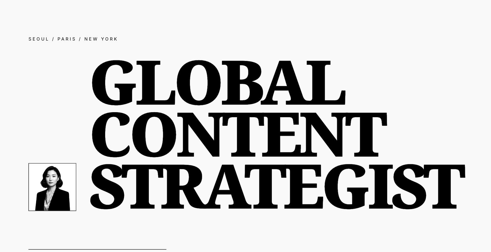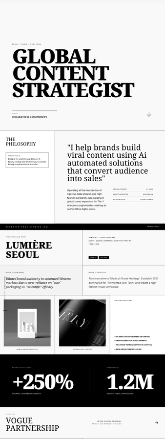 “Design a high-fidelity single-page portfolio for a mid-level [female global content marketer] targeting the [K-beauty industry]. The page should feel like an editorial digital portfolio with brutalist structure, 1px black grid lines, oversized serif headlines, and geometric sans-serif body text, as a single page portfolio.