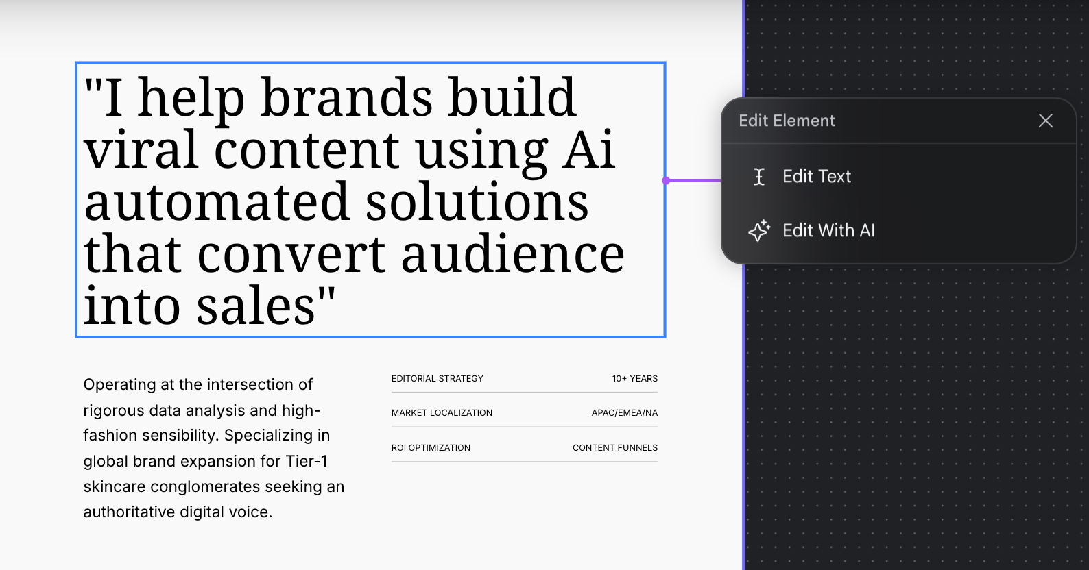 I’ve omitted the latter part of the page design for readability, but basically, you can go ahead and edit out these fields with the projects you’ve done so far. The AI generated page gives you example layout and images to work with, so you have an idea of where to get started.