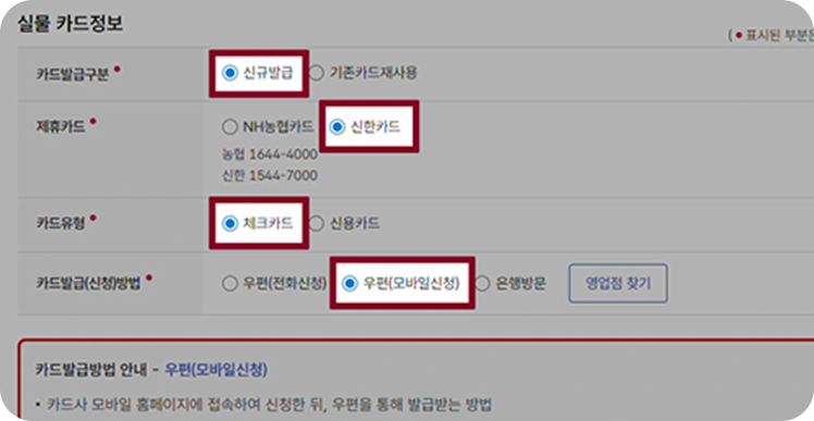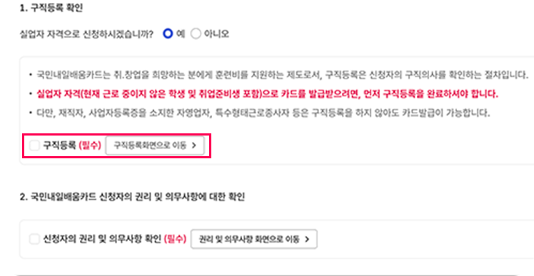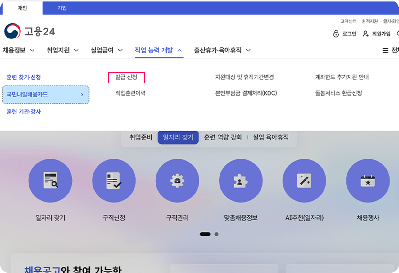 Access Work24: Go to website > 직업능력 개발 > 국민내일배움카드 > 발급신청